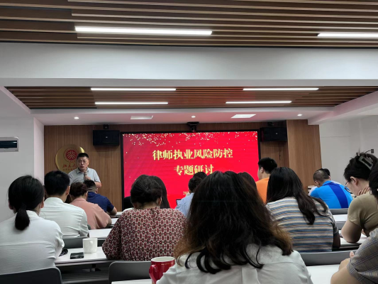 2023年6月30日下午,江苏圣典泰州律师事务所全体律师在会议室参加有关律师执业风险会议,由律所主任吴银书担任主讲。