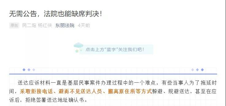 6月19日,东丽法院发布了一篇《无需公告,法院也能缺席判决!》的文章,介绍了该法院遭遇送达难,但不必公告送达即行缺席审理的一则案例: