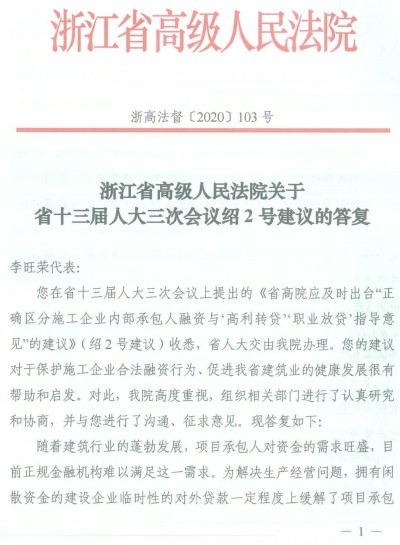 您在省十三届人大三次会议上提出的《省高院应及时出台“正确区分施工企业内部承包人融资与‘高利转贷’‘职业放贷’指导意见”的建议》(绍2号建议)收悉,省人大交由我院办理。您的建议对于保护施工企业合法融资行为、促进我省建筑业的健康发展很有帮助和启发。对此,我院高度重视,组织相关部门进行了认真研究和协商,并与您进行了沟通、征求意见。现答复如下:
