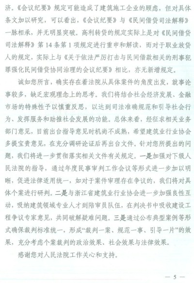 诚如您所言,确实存在着法院从具体案件的角度出发,就事论事较多,缺乏宏观理念上的思考。我们将结合社会经济发展、金融市场的特殊性予以慎重反思,以达到司法准确规范和引导社会行为、发挥服务和助推社会发展的功能。总体来看,经征求相关业务部门意见,目前出台指导意见时机尚不成熟,希望建筑业行业协会多提宝贵意见,在充分调研论证后再出台文件针对您所提出的问题,我们将进一步贯彻落实相关文件有关规定。一是加强对下级人民法院的指导,通过年度民事审判工作会议等形式进一步加以明晰,促进法律适用统一,如对于案件审理存在争议的,我们将对具体个案进行研判。二是与浙江省建筑业行业协会进一步加强良性互动,吸纳建筑领域专业人才到陪审员队伍,在判决书中吸收建设工程争议专家意见,共同破解疑难问题。三是通过公布典型案例等形式确保裁判标准统一,形成“裁判一案、规范一事、引导一片”的效果,充分考虑个案裁判的政治效果、社会效果与法律效果。